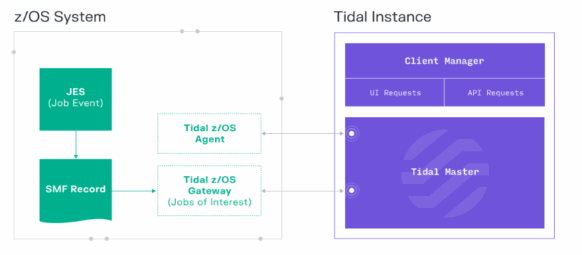 Tidal’s z/OS integration consists of a native agent running in the z/OS Unix System Services (USS) environment, plus an optional Gateway component that monitors lifecycle via System Management Facility (SMF) records.